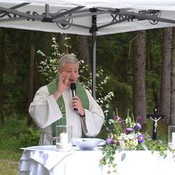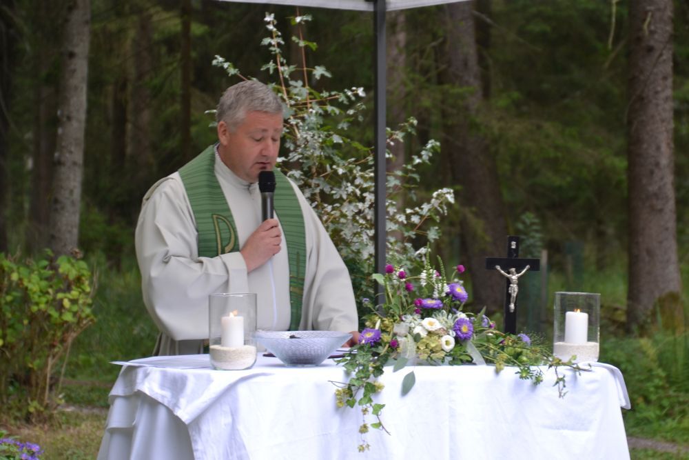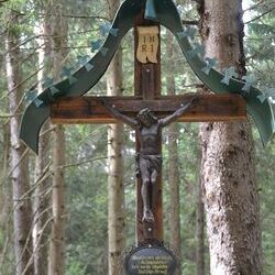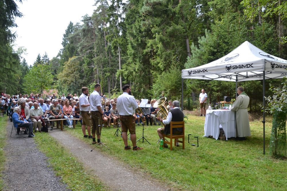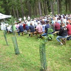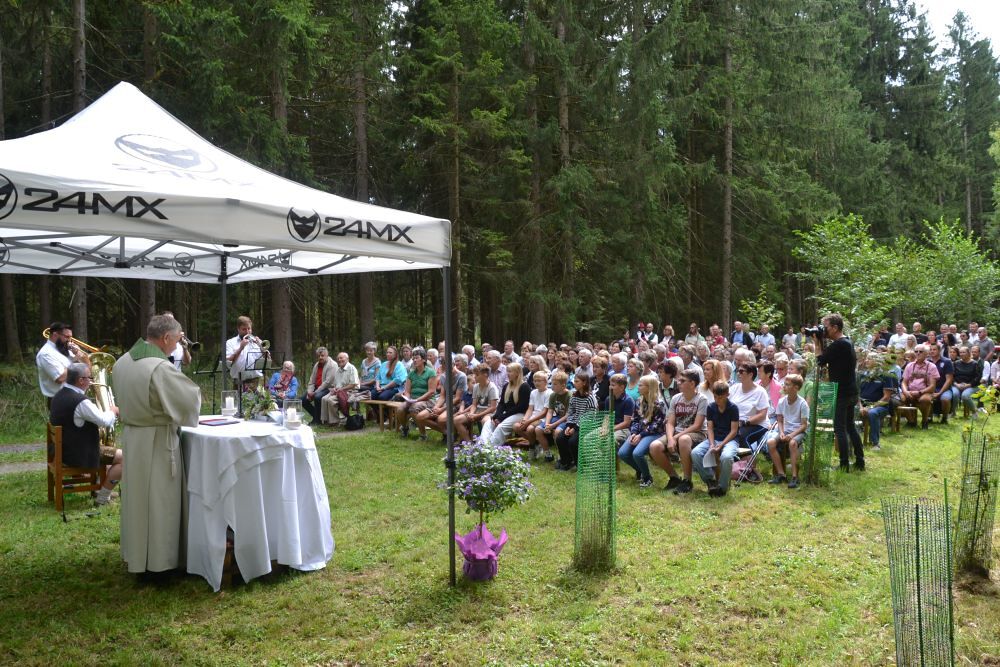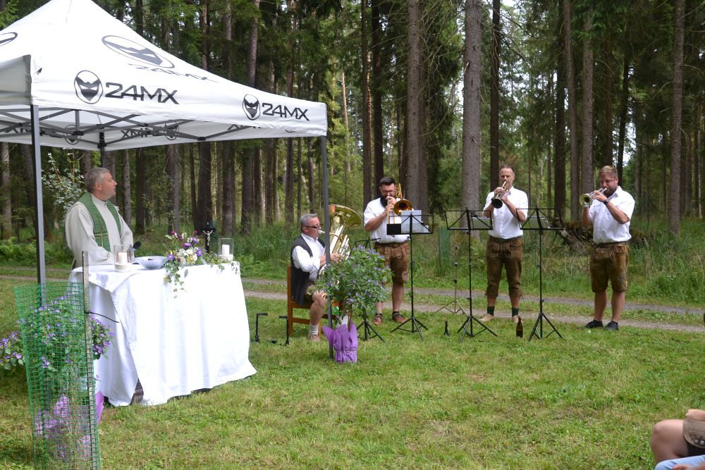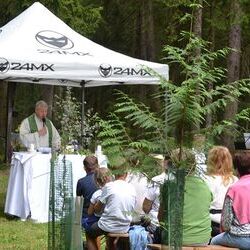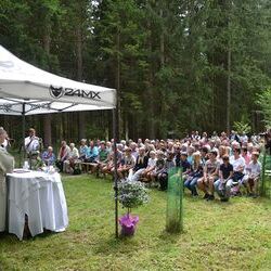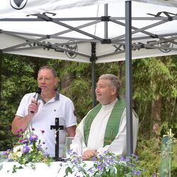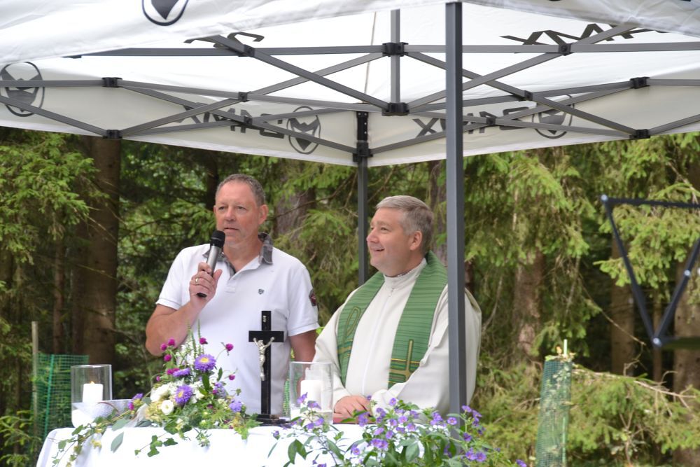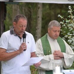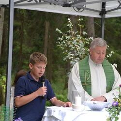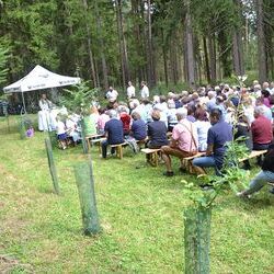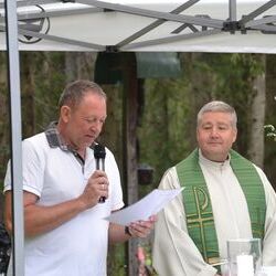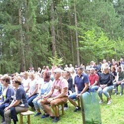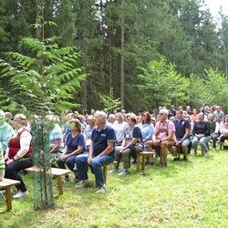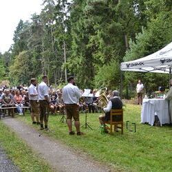 - Pfarrer Claudiu Budau feierte beim sogenannten "Woldteifl-Kreuz" mit vielen Mitfeiernden eine Wortgottesfeier - musikalische Gestaltung durch ein Bläserquartett des Musikvereins der Graz Linien