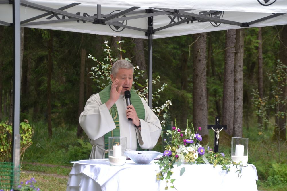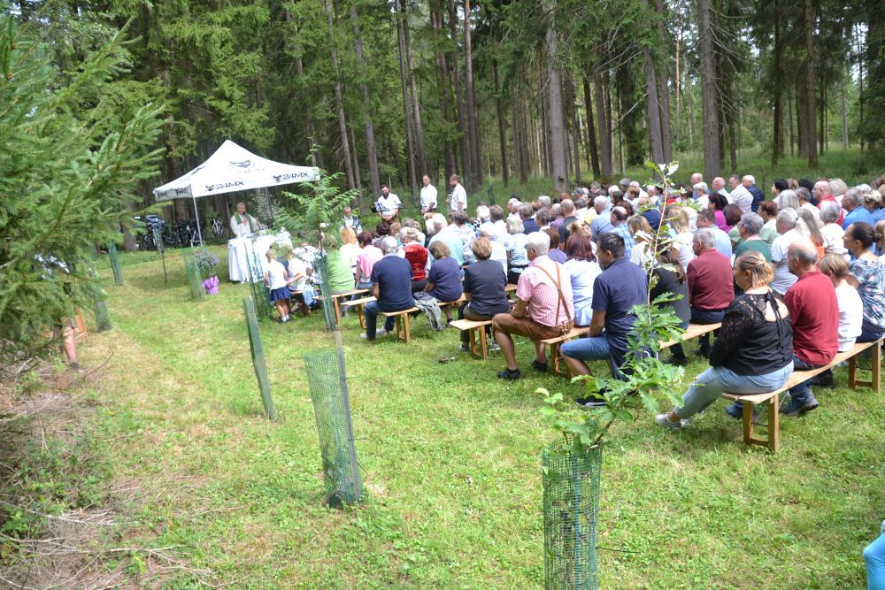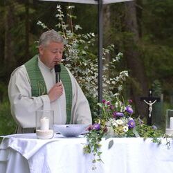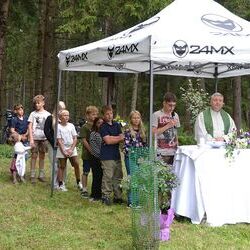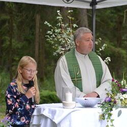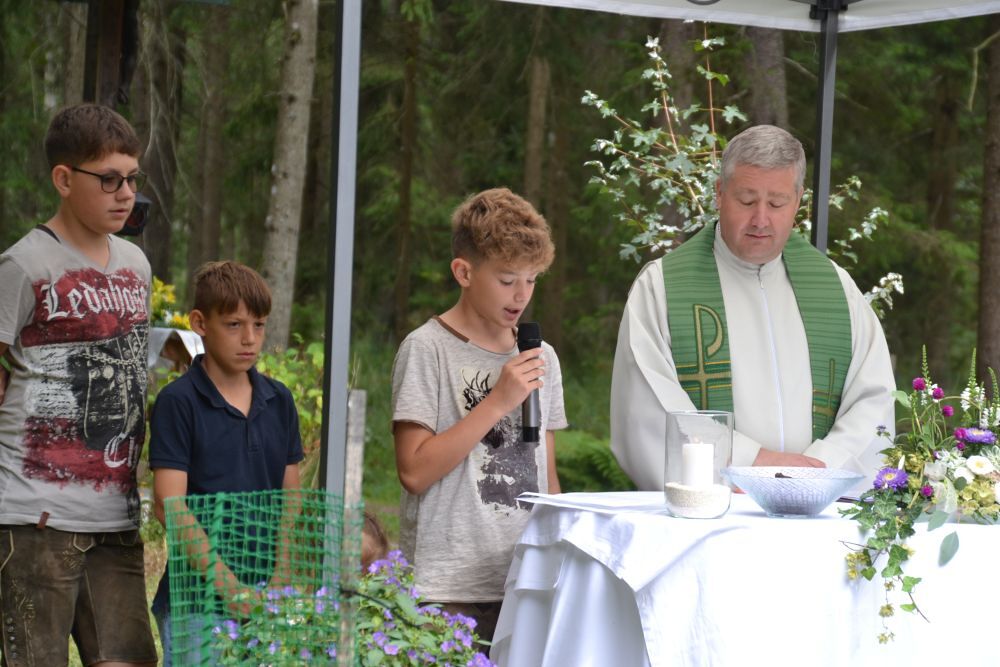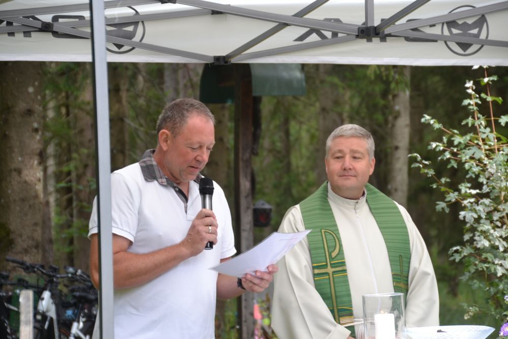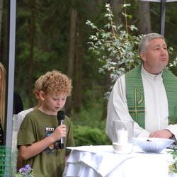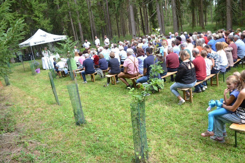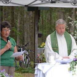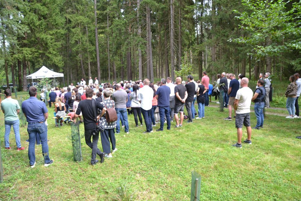 - Pfarrer Claudiu Budau feierte beim sogenannten "Woldteifl-Kreuz" mit vielen Mitfeiernden eine Wortgottesfeier - musikalische Gestaltung durch ein Bläserquartett des Musikvereins der Graz Linien